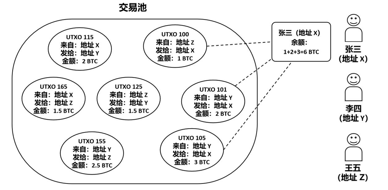 Chaque « compte » du système Bitcoin correspond à une adresse spécifique. La blockchain Bitcoin ne suit pas directement le solde de chaque adresse. Elle stocke l'historique complet des transactions. Le système Bitcoin suit la collecte de tous les UTXO du réseau blockchain via le « pool de transactions ». Le « solde » d'une adresse à un instant T est calculé en additionnant tous les UTXO associés à cette adresse. Lorsqu'un UTXO est utilisé, il est supprimé du pool de transactions, ce qui se reflète dans le calcul du solde en temps réel.