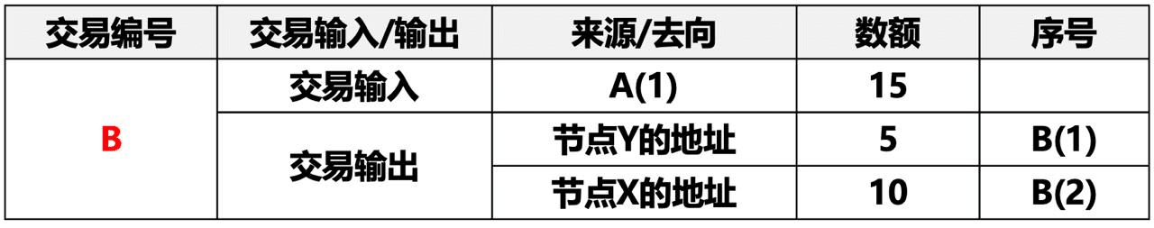 Dans cette transaction, le nœud X consomme les 15 bitcoins précédemment obtenus (en entrée), générant deux nouvelles sorties de transaction non dépensées (UTXO) : une pour les 5 bitcoins du nœud Y et l'autre pour les 10 bitcoins restants du nœud X.
