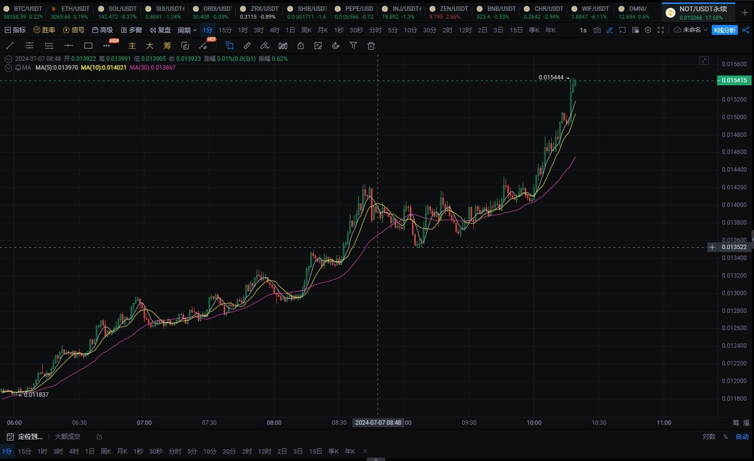 Comme le montre la figure, NOT/USDT a une tendance à la hausse évidente sur une courte période de temps, le prix est supérieur aux moyennes mobiles à court terme (MA5 et MA10), et les deux moyennes mobiles montrent une divergence évidente à la hausse. montrant une forte dynamique haussière à court terme.