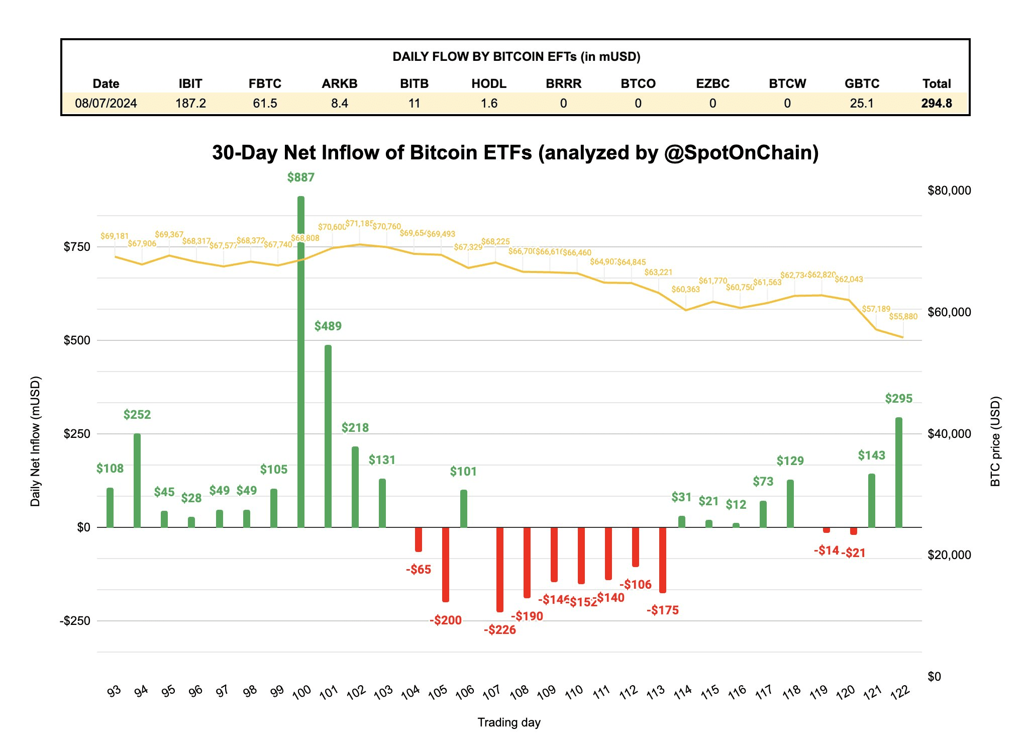 Fait remarquable, le 8 juillet 2024 a été témoin d’un afflux net substantiel de 295 millions de dollars dans les ETF Bitcoin, marquant l’afflux net le plus élevé observé au cours des 21 derniers jours de bourse. Cet afflux impressionnant fait suite à la vente par le gouvernement allemand de Bitcoin d'une valeur d'un milliard de dollars, soulignant la résilience et le fort intérêt des investisseurs pour les ETF Bitcoin.