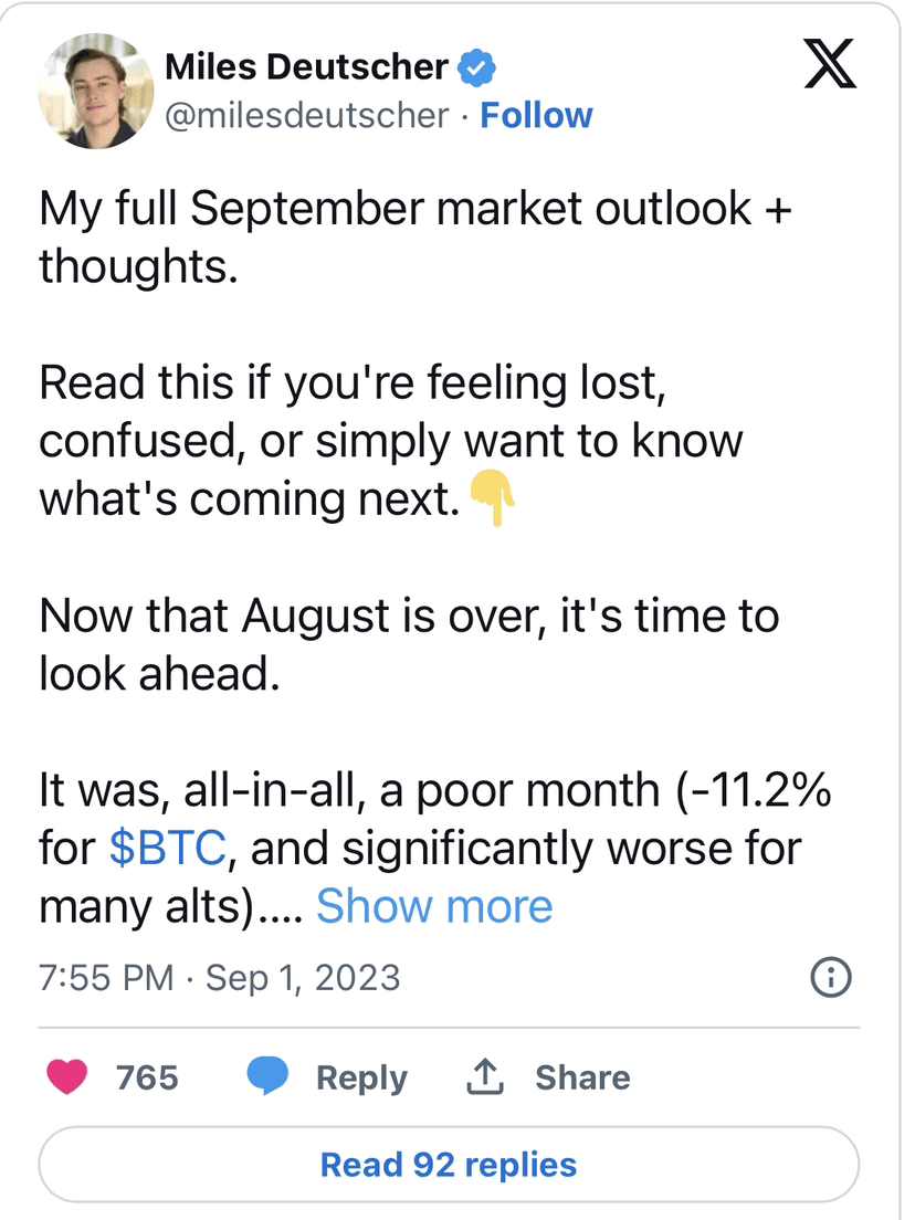 Historiquement, septembre est le mois le plus sanglant pour les taureaux Bitcoin (BTC). Cette fois, les choses pourraient être encore pires, estime l'analyste Miles Deutscher. Les marchés de la cryptographie, en particulier le Bitcoin (BTC) et les altcoins à grande capitalisation, seront aux prises avec un contexte macroéconomique controversé, une incertitude réglementaire et des « déverrouillages » massifs de certains jetons populaires.