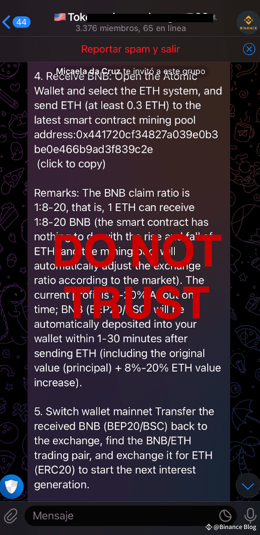 Remarque : dans le chat de ce groupe, l’escroc proposait de fausses possibilités de minage, demandait aux utilisateurs de payer en ETH et offrait de faux BNB.