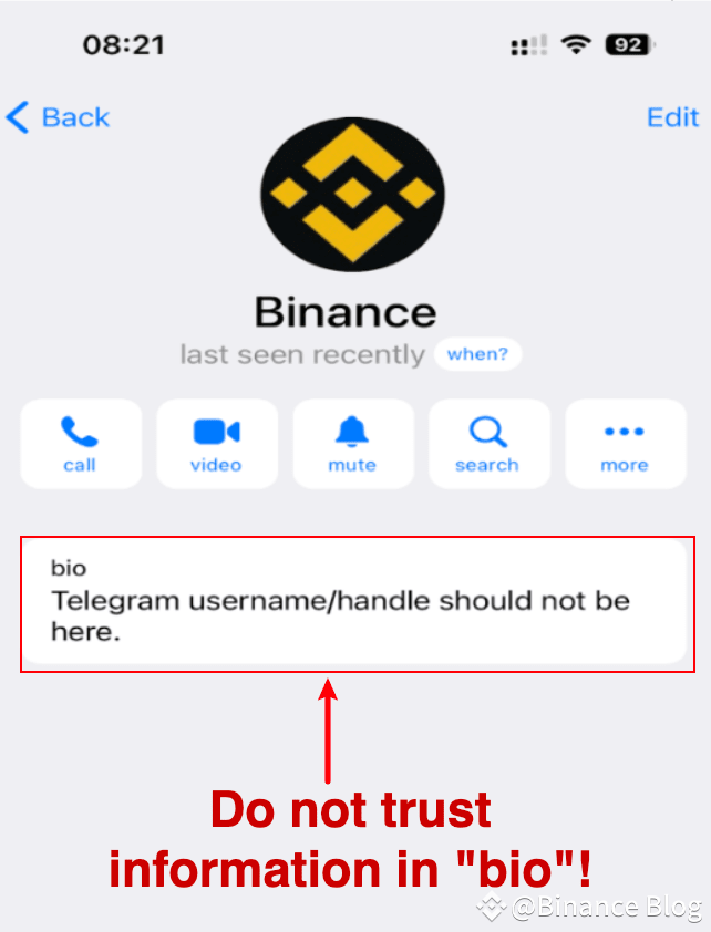 Vérifiez toujours soigneusement les détails de vos contacts sur Telegram depuis la page de leur profil, en particulier le nom d’utilisateur, et ne vous fiez pas au contenu de leur biographie : ce champ est en effet facilement manipulable et n’importe qui peut prétendre appartenir aux canaux officiels de Binance. Vous retrouverez ci-dessous une capture d’écran de la page du profil d’un utilisateur type : vous remarquerez que les arnaqueurs masquent souvent le nom d’utilisateur tout en ajoutant des informations semblant officielles dans la biographie pour tromper les utilisateurs.