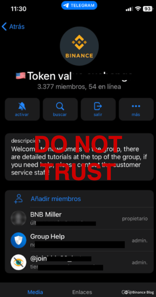 Voici un faux groupe Telegram. Plusieurs utilisateurs ont été spammés et ajoutés à un groupe Binance sur Telegram, qui utilisait le logo de Binance et disposait d’un canal de discussion permettant de parler avec un faux représentant du service client de Binance.