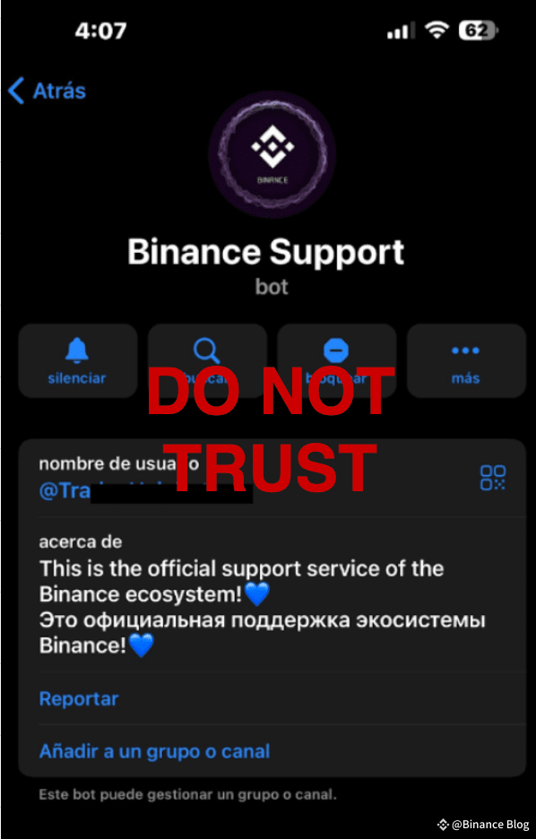 Remarque : le bot est nommé « Binance Support » (Service client de Binance) sur l’application, mais ce compte n’est pas un canal officiel de Binance.