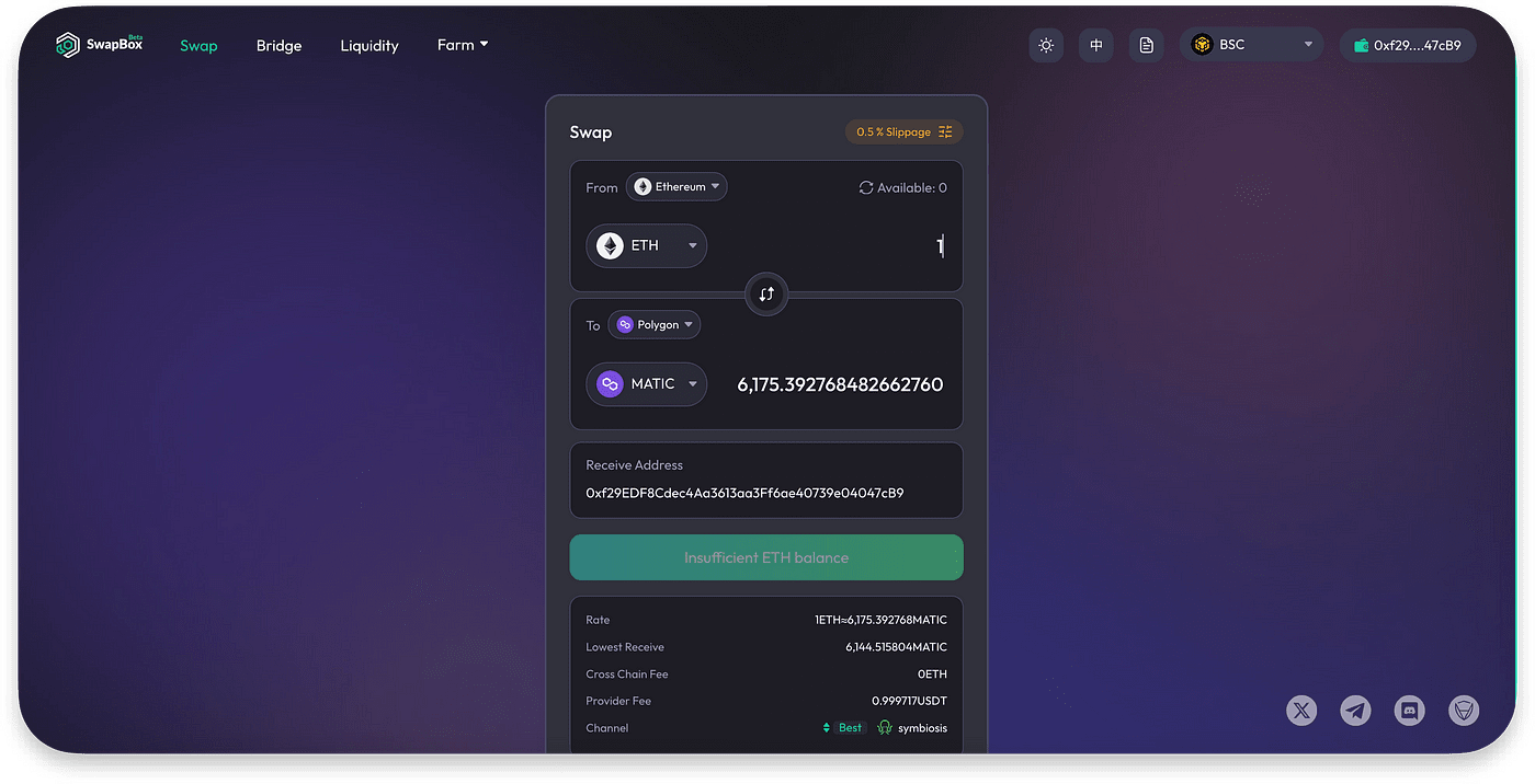 SwapBox fournit des fonctionnalités d'échange et d'échange entre chaînes, regroupe les liquidités de plusieurs échanges décentralisés et localise automatiquement la meilleure route d'échange pour les utilisateurs.