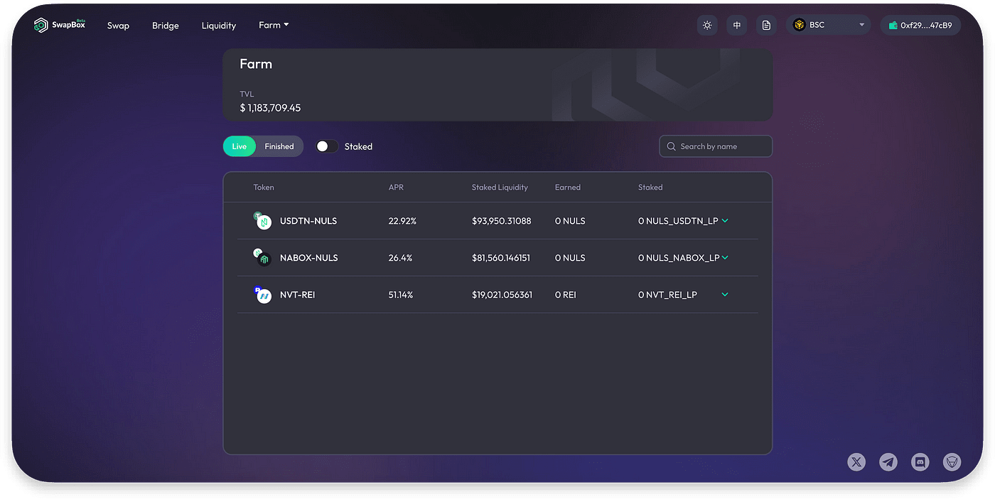 La ferme L1 permet aux utilisateurs de miser des jetons LP sur SwapBox et de gagner des revenus sur les réseaux pris en charge par Nabox Wallet. Actuellement, il n’y a pas de session de minage en direct sur la ferme L1.