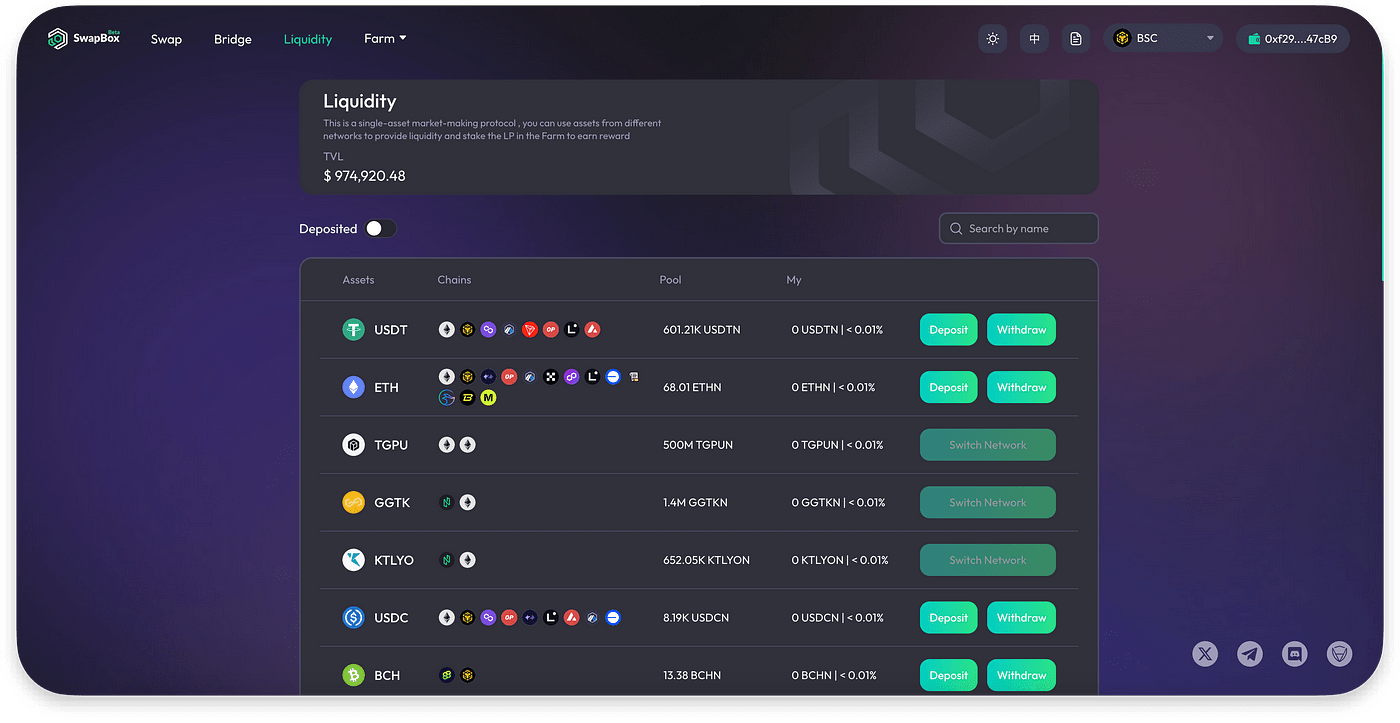 Les pools de liquidité SwapBox permettent aux utilisateurs de relier les actifs sur plusieurs chaînes. Par exemple, l’un des actifs les plus courants, l’USDT, est émis dans différentes blockchains. Afin de rendre l'USDT disponible pour les utilisateurs multichaînes, nous avons ajouté des liquidités sur différentes blockchains sur SwapBox, afin que les utilisateurs puissent croiser l'USDT sur différents réseaux beaucoup plus facilement, au lieu de compter sur les échanges et les retraits sur DEX. Jusqu'à présent, nous avons déployé USDT, ETH, TGPU, GGTK, BCH,… en utilisant la fonction de liquidité.