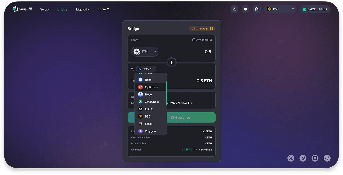 Avec SwapBox (ancien NerveBridge), vous pouvez facilement relier les actifs traditionnels entre nos réseaux pris en charge : ETH, USDT, BNB, USDC, etc.