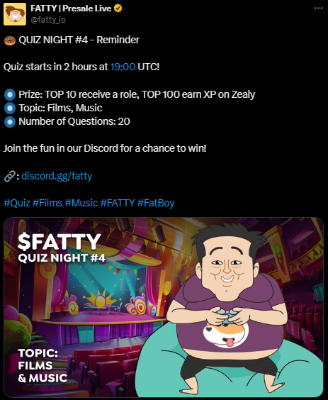 La plateforme organise chaque semaine des soirées quiz pour offrir à la communauté une chance de gagner de l'XP sur Zealy et un rôle. FATTY Token Quiz Night 3 a été organisée le 25 juillet et était basée sur le vrai et le faux. Quiz Night 2 était lié à la culture générale et le premier quiz était associé aux drapeaux du monde.