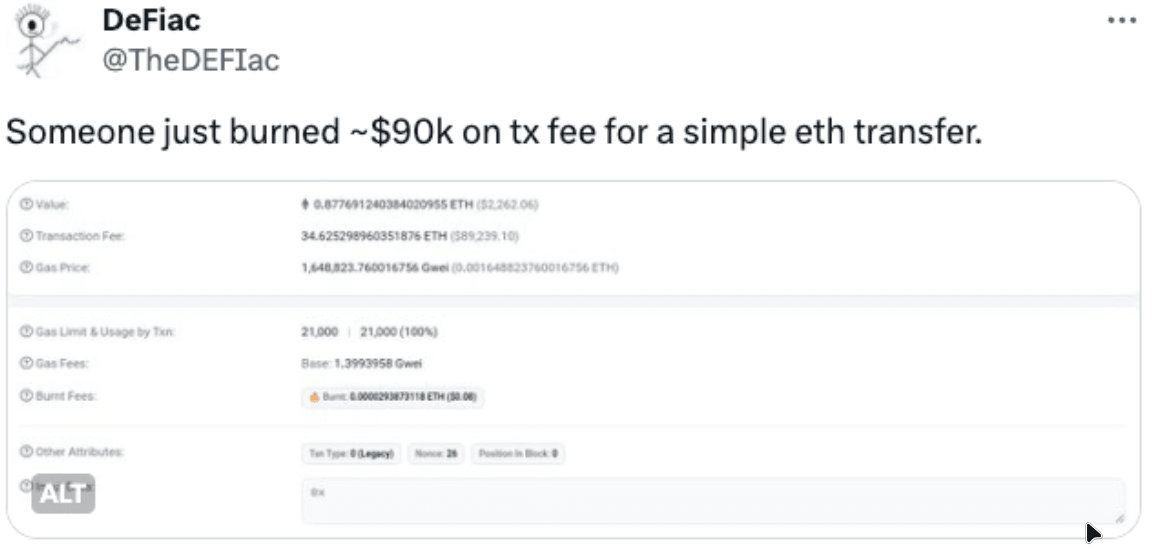Un utilisateur de crypto anonyme aurait commis une erreur coûteuse, dépensant 34 ETH en frais de gaz pour transférer un peu plus de 2 200 $ d'Ether. Cette gaffe a entraîné des frais faramineux de 90 000 $ pour une transaction qui n'aurait dû coûter que quelques dollars. Selon les données d'Etherscan partagées par un utilisateur appelé DeFiac le 11 août, l'utilisateur a payé 34,26 ETH en frais de gaz (environ 89 200 $ au taux actuel) pour envoyer 0,87 ETH, évalué à environ 2 262 $. À l'époque, les frais de gaz d'Ethereum étaient aussi bas que 2 à 4 Gwei, ce qui signifie qu'un transfert typique ne coûterait qu'environ 5 $ à quelqu'un. Cela signifie que l'utilisateur a payé en trop un incroyable 1 783 900 %.