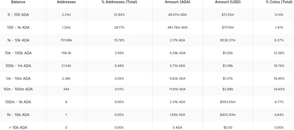 Il y a au total 4,443 millions d'adresses qui détiennent ADA (nous ne pouvons pas compter toutes les adresses de portefeuille froid, donc le nombre est plus élevé). Mais pour les adresses que nous pouvons compter, voici les données :