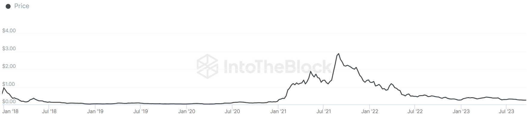 Le plus bas historique est à 0,01735 $ tandis que le plus haut historique est à 3,10 $, ce qui représente un gain de +16477%.