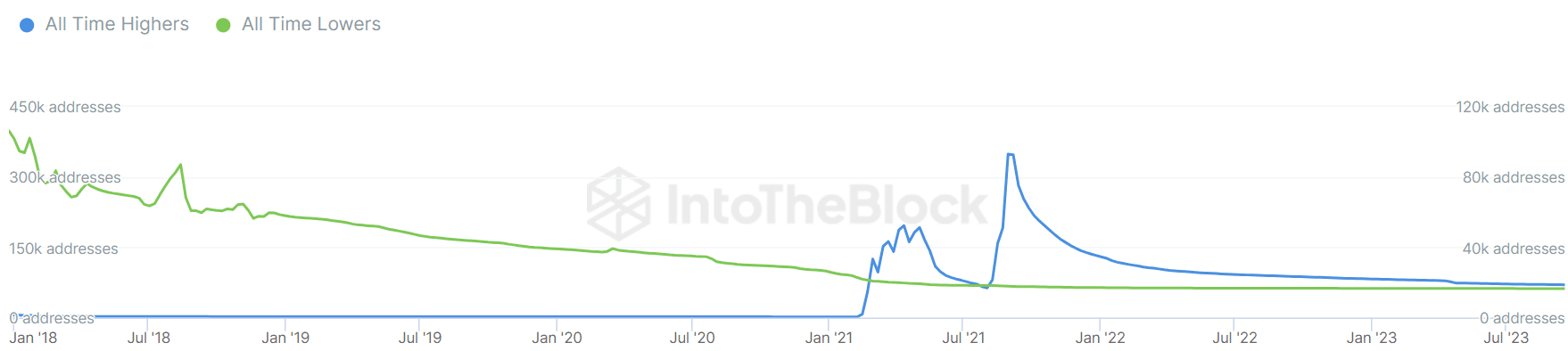 Le graphique suivant montre deux catégories : "Tous les temps hauts," qui sont des adresses avec un solde qui a acheté dans les 20 % du prix le plus élevé de tous les temps (ATH), et "Tous les temps bas," qui sont des adresses avec un solde qui a acheté dans les 20 % du prix le plus bas de tous les temps (ATL).