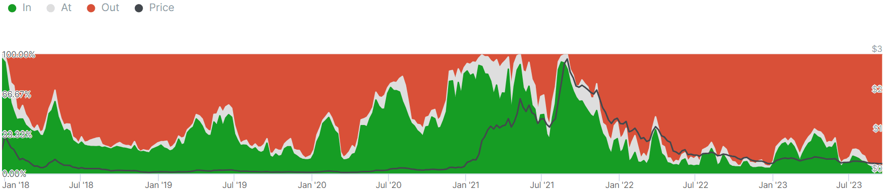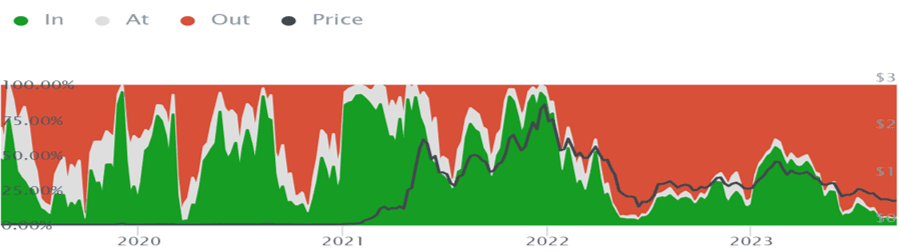 Sur le graphique du bas, vous pouvez voir le pourcentage de comptes en profit et en perte au fil du temps en corrélation avec le prix. Naturellement, au début, la majorité était en profit, et cela a également été vrai pendant la montée du marché. Cependant, à mesure que le marché haussier touchait à sa fin, les chiffres ont rapidement changé, nous laissant là où nous en sommes maintenant, avec seulement 3.94 % de comptes en profit. Nous pouvons également voir moins de pics jusqu'à 100 % que dans d'autres altcoins comme MATIC (graphique du bas, graphique ajouté pour comparaison).