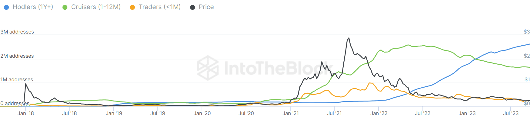 Comme vous pouvez l'imaginer, pendant le marché baissier, le nombre de Hodlers (adresses qui ont détenu la pièce pendant plus d'un an) a augmenté et a même dépassé les Cruisers (adresses qui ont détenu la pièce pendant 1 à 12 mois). Cela pourrait également être interprété comme un signe que les gens placent leur espoir dans ADA pour le prochain marché haussier.