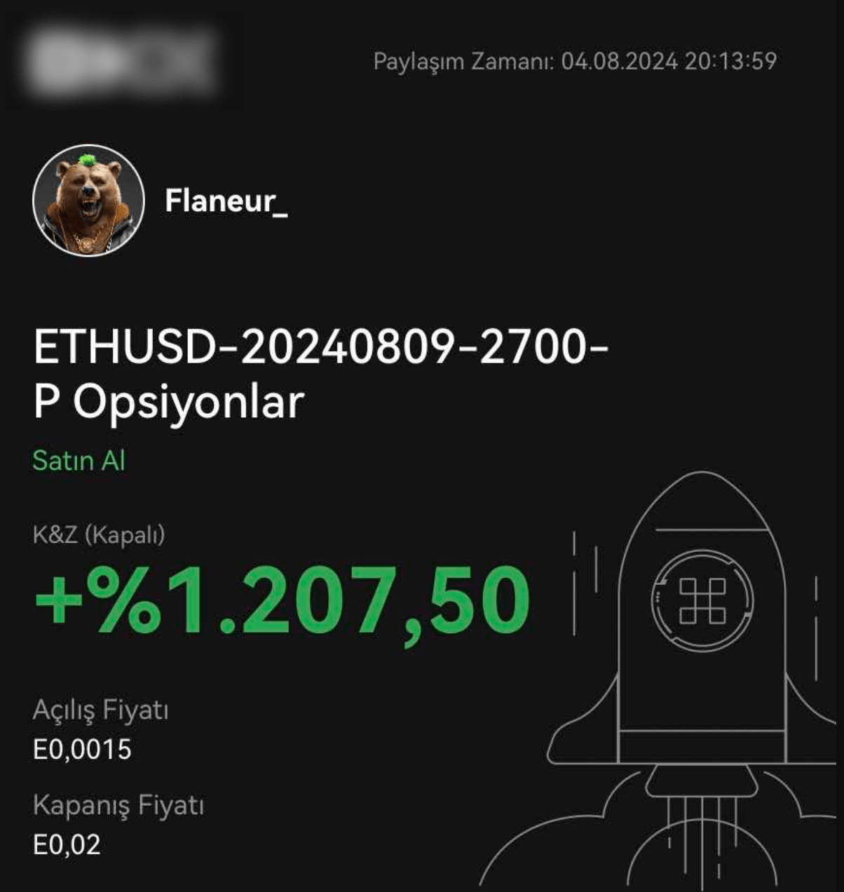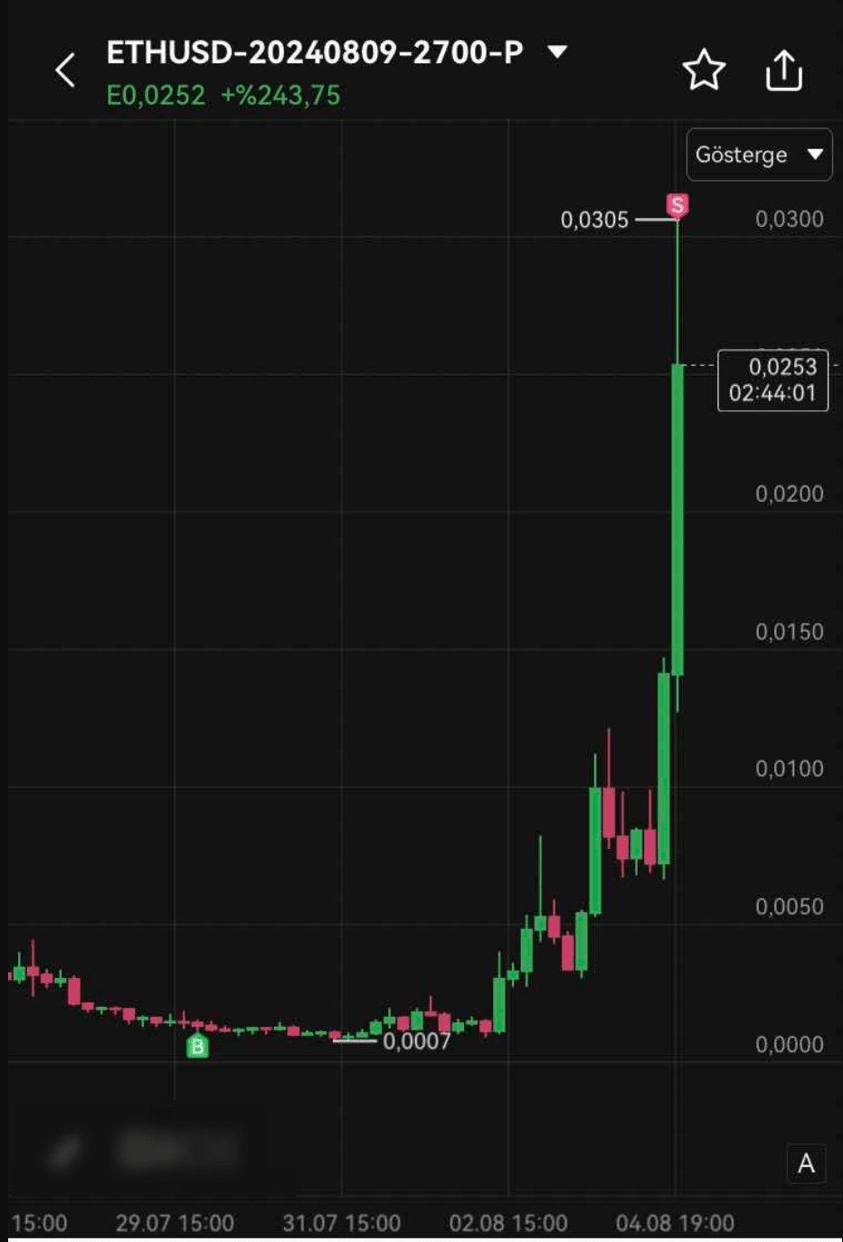 Laissez-moi vous donner un exemple concret. Il y a quelques semaines,$ETH était à 3200 $, j'ai acheté un contrat Put de 2700 $ le 9 août pour 5 $ (0,0015 ETH). Si je n'avais pas vendu quand il a fait un retour sur investissement de 12x, j'aurais gagné 400 $ le 9 août quand ETH était à 2300 $. Cela représente un retour sur investissement de 80x. Lorsque l'ETH est tombé à 2100 $ le 5 août, le prix du contrat a atteint 0,3 ETH, soit un retour sur investissement de 200x. J'étais au sens figuré fou à ce moment-là.