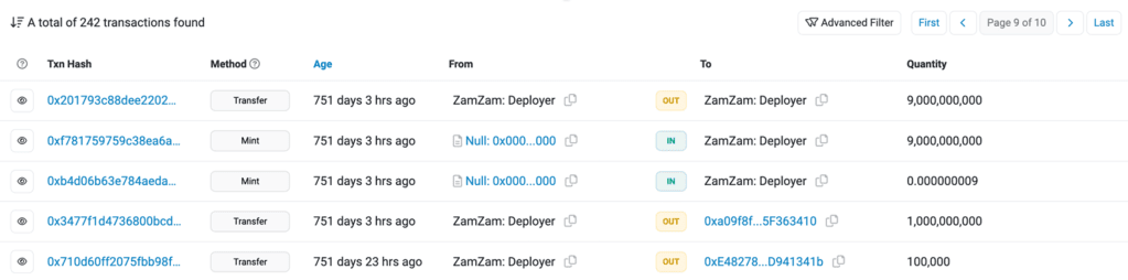Pour détecter cette méthode frauduleuse, on peut se rendre sur la page du contrat du token et examiner les transactions. Si une icône avec « Mint » écrit à l'intérieur est trouvée, cela indique la présence de cette technologie dans le contrat du token. L'image ci-dessous donne un exemple de cette technologie « Mint ».