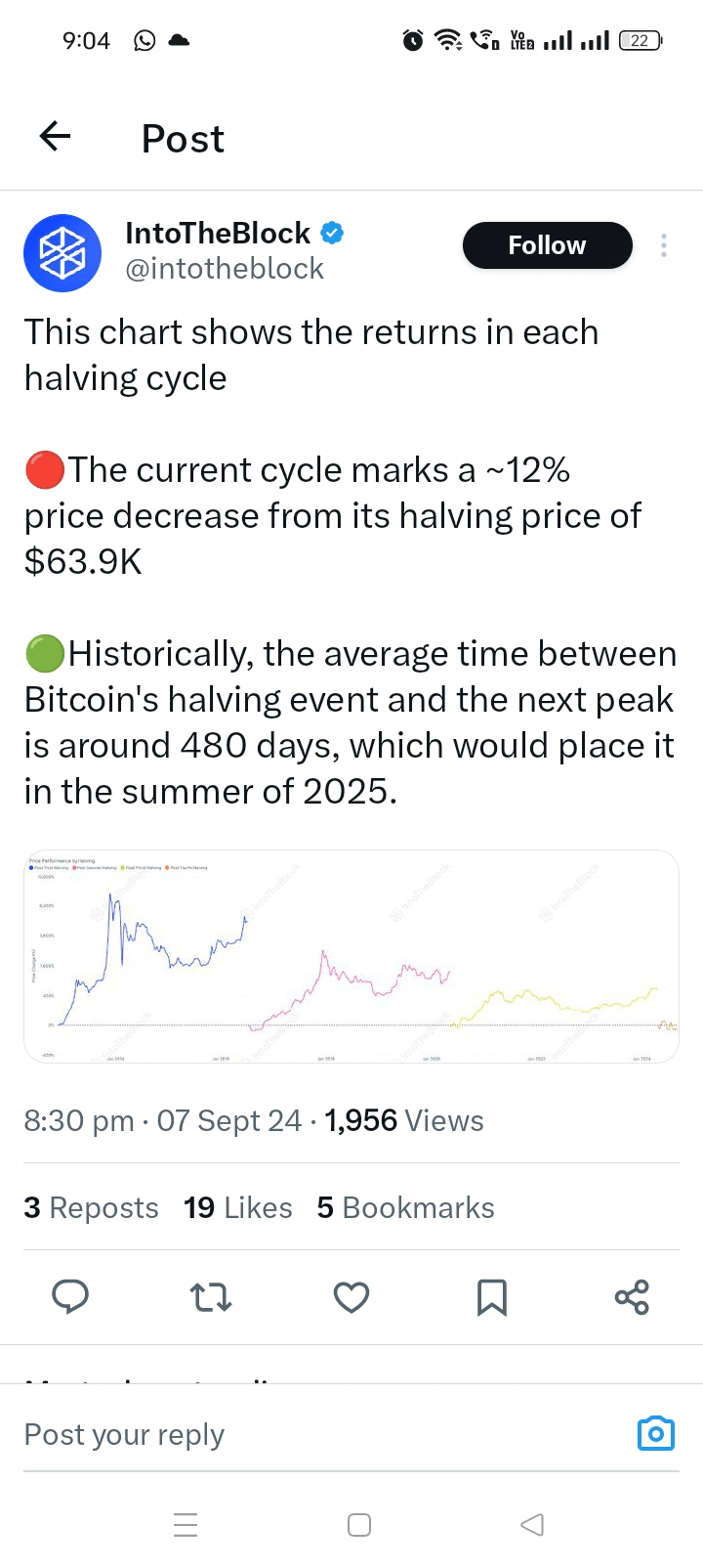 Ce graphique montre les rendements de chaque cycle de réduction de moitié. Le cycle actuel marque une baisse de prix d'environ 12 % par rapport à son prix de réduction de moitié de 63,9 000 $. Historiquement, le temps moyen entre l'événement de réduction de moitié du Bitcoin et le prochain pic est d'environ 480 jours, ce qui le placerait à l'été 2025. pic.twitter.com/ZTraSvbegk