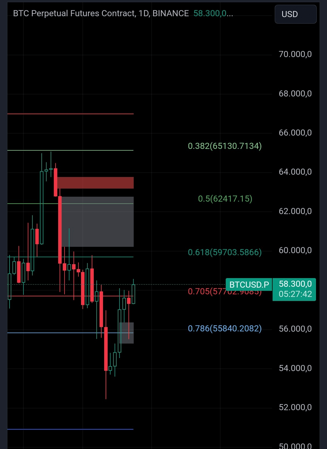 Après de nombreuses tentatives, nous avons finalement cassé la résistance à 57.700 en vue de passer au niveau suivant à 59.700. Le fait est que le prix doit clôturer au-dessus du niveau et donner une confirmation, c'est-à-dire être accompagné de : Un volume d'achat et une bougie de continuité haussière.