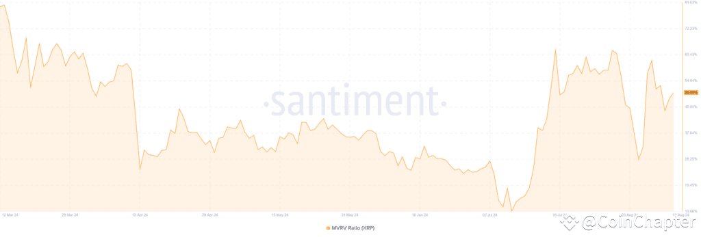 À la mi-mars, le MVRV a atteint 81,03 %, indiquant que de nombreux détenteurs de XRP étaient en profit et avaient probablement vendu. Début août, le ratio était tombé à 10,66 %, ce qui signifie que la plupart des détenteurs étaient perdus et attendaient de meilleurs taux. À la mi-août, le ratio s'est élevé à 50,65%, témoignant d'un regain de confiance des investisseurs.