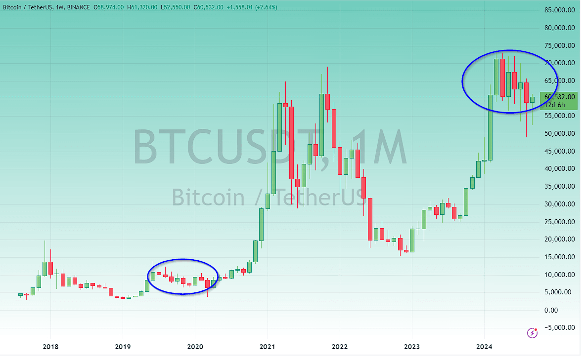J'ai en quelque sorte lié les événements de 2020 aux mouvements volatils actuels du marché après la réduction de moitié.