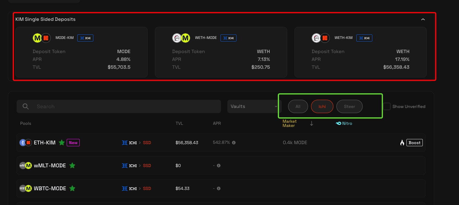Accédez à la section Pools de Kim, utilisez le filtre à droite pour filtrer les pools ICHI qui prennent en charge les dépôts unilatéraux.