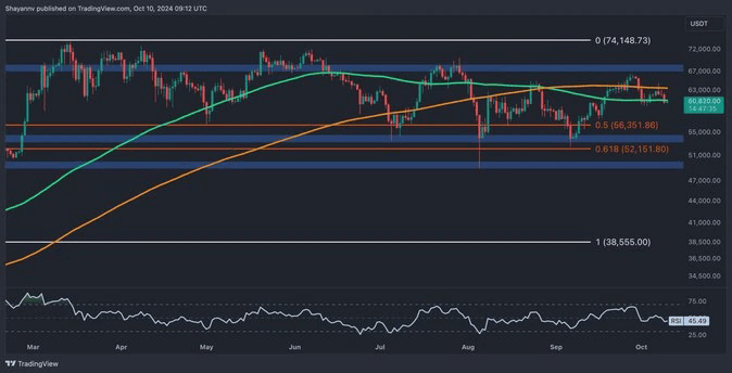 Actuellement, le Bitcoin évolue sous la moyenne mobile à 200 jours de 63 400 $ et se situe autour de la moyenne mobile à 100 jours, autour de 61 000 $. Cette zone est critique, car le support à 60 000 $ est à la fois psychologique et substantiel.