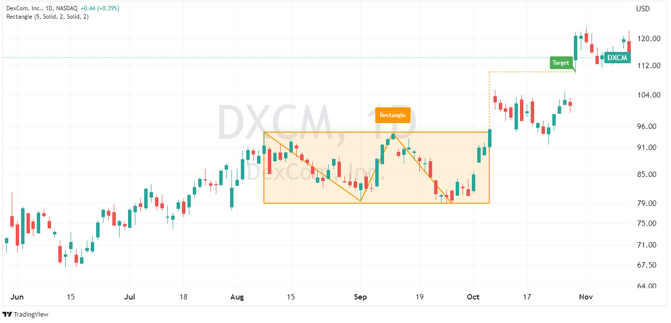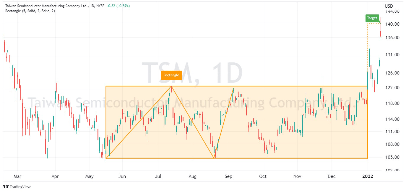 Un modèle de fond rectangulaire se produit lorsque le prix se consolide au bas d'une tendance à la baisse, créant un modèle en forme de « www ». Ce modèle peut indiquer que le prix du titre pourrait bientôt commencer à augmenter ou à diminuer en fonction de la direction de la cassure.