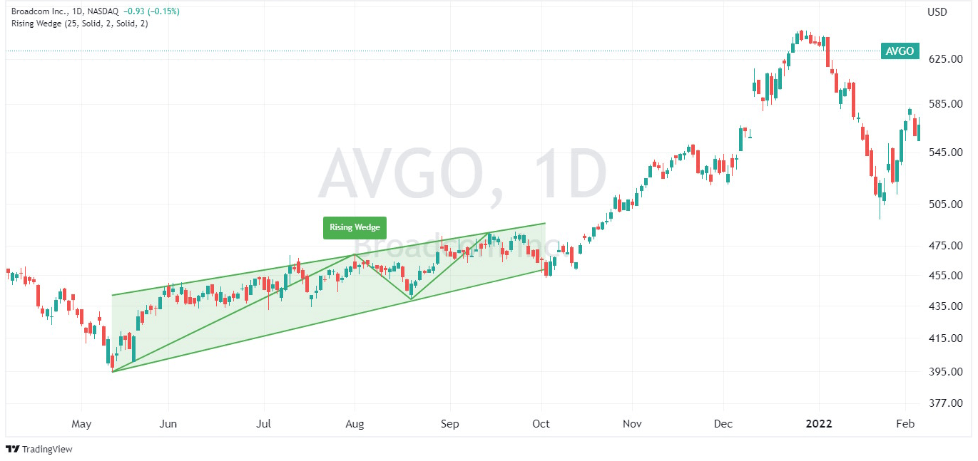 Le Falling Wedge se produit lorsque le prix forme deux lignes de tendance convergentes, la ligne inférieure étant plus inclinée que la ligne supérieure, créant ainsi un motif en forme de coin pointant vers le bas. Ce motif peut indiquer que le prix du titre pourrait bientôt commencer à augmenter.