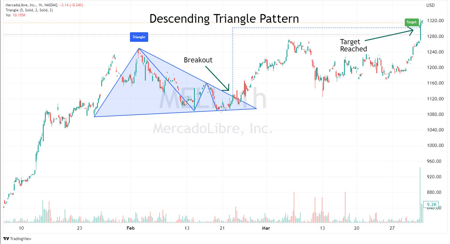 Un triangle descendant se produit lorsque le prix forme deux lignes de tendance descendantes qui convergent l’une vers l’autre, créant ainsi un motif en forme de triangle pointant vers le bas. Ce motif peut indiquer que le prix du titre pourrait bientôt commencer à augmenter.