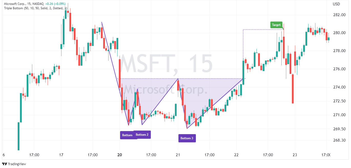 Un triple creux se produit lorsque le prix atteint le plancher trois fois, créant un motif en forme de « VVV ». Ce motif indique souvent que le prix de l'actif pourrait bientôt commencer à augmenter.