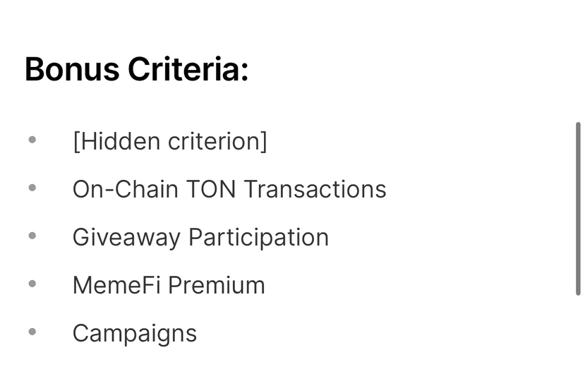 Une grande partie de l'airdrop (~85 %) revient aux utilisateurs de l'application Telegram. Les principaux facteurs ici sont le montant que vous avez dépensé en TON et en Stars, ainsi que le nombre total de pièces MemeFi que vous détenez. Plus vous en avez, meilleures sont les récompenses, et il existe des multiplicateurs de bonus pour les activités supplémentaires comme les transactions en chaîne et la participation à des cadeaux.