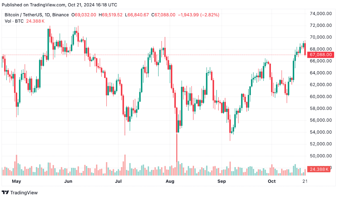 Le Bitcoin a suivi une trajectoire ascendante constante tout au long du mois d'octobre, affectueusement surnommée « Uptober » par la communauté crypto. Au 21 octobre, le BTC se négocie à 67 100 $, un sommet de 3 mois et un niveau jamais vu depuis fin juillet. Il y a quelques jours à peine, le Bitcoin a brièvement grimpé à 69 500 $ avant de reculer lorsque les vendeurs sont entrés sur le marché, ralentissant la dynamique.