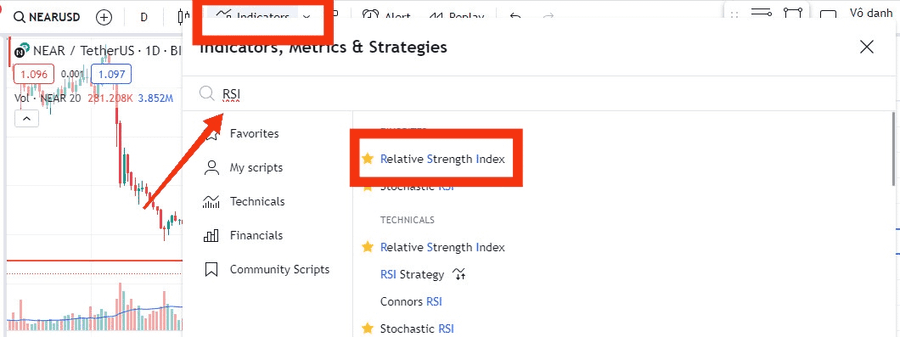 1. Accédez à tradingview et sélectionnez Indicateurs => sélectionnez l'indicateur RSI.