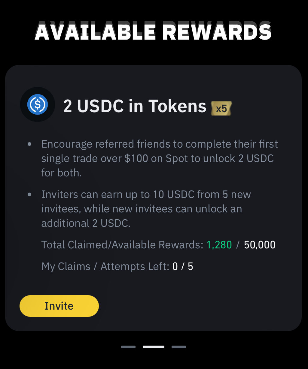 Il vous suffit d'inviter un ami à rejoindre Binance et de le faire passer une commande au comptant de plus de 100 $. Vous débloquerez tous les deux instantanément un bon de 💰2 USDC jusqu'à 5 fois, et vous vous rapprochez également de la possibilité de gagner jusqu'à 1 000 USDC en bons ! 🥳