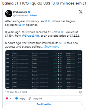 Les prix des ETH ont chuté d’environ 15 % après la vente. Selon les données de Lookonchain, le portefeuille a reçu 245 908 ETH lors de l'ICO du projet avec un investissement initial de 79 000 $, soit une valeur d'environ 772 millions de dollars aux prix actuels. Les actifs du portefeuille valaient 1,2 milliard de dollars lorsque l'ETH était à son prix le plus élevé jamais enregistré en 2021.