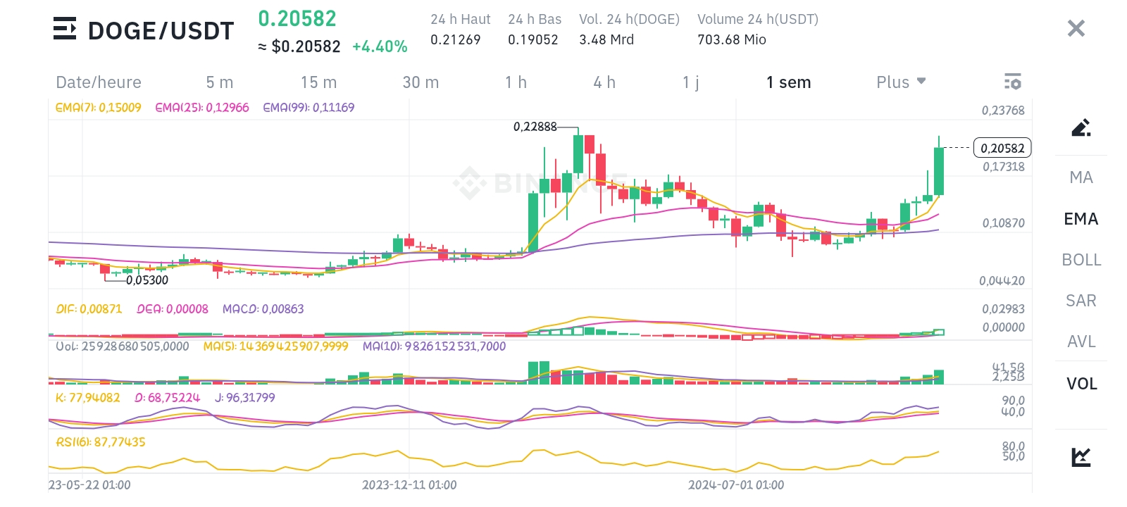 Volume : Le volume élevé des derniers jours montre une forte demande pour DOGE. Cependant, des volumes élevés associés à un RSI élevé suggèrent une prudence pour éviter d’acheter à un sommet potentiel.