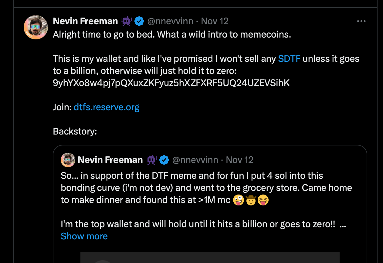 Le PDG de Reserve, @nnevvinn, a ouvertement soutenu $DTF, détenant une certaine quantité de $DTF sur son adresse Solana (9yhYXo8w4pj7pQXuxZKFyuz5hXZFXRF5UQ24UZEVSihK), qu'il a partagée publiquement. Son point de vue : il conservera $DTF soit à une valorisation de 1 milliard, soit à zéro, bien qu'il appelle également à la prudence, rappelant à la communauté les risques inhérents aux jetons mèmes.