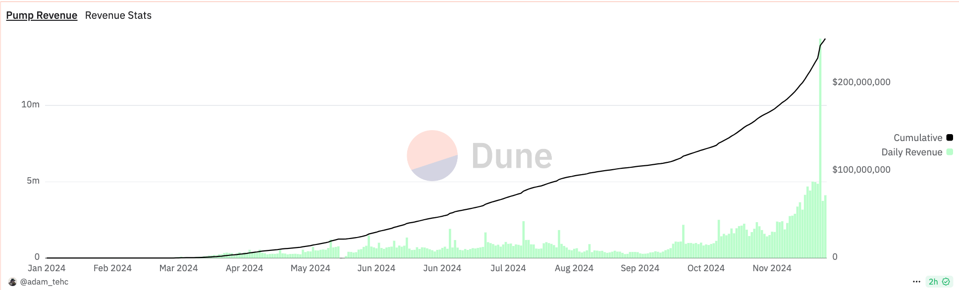 Depuis mars, Pump.fun a connu une augmentation constante de l'activité des utilisateurs. À ce jour, la plateforme a accumulé plus de 250 millions de dollars de revenus et déployé plus de 3,8 millions de jetons, avec des tendances de croissance se poursuivant à la hausse.