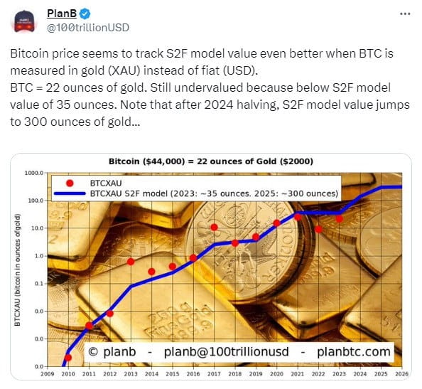 Il souligne que BTC ne vaut désormais que 22 onces troy d'or, tandis que S2F indique un minimum de 35 onces (c'est-à-dire que Bitcoin est sous-évalué)
