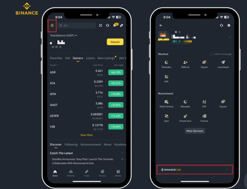 Appuyez sur le coin supérieur gauche de votre écran d'accueil, vous verrez écrit Binance Lite en bas