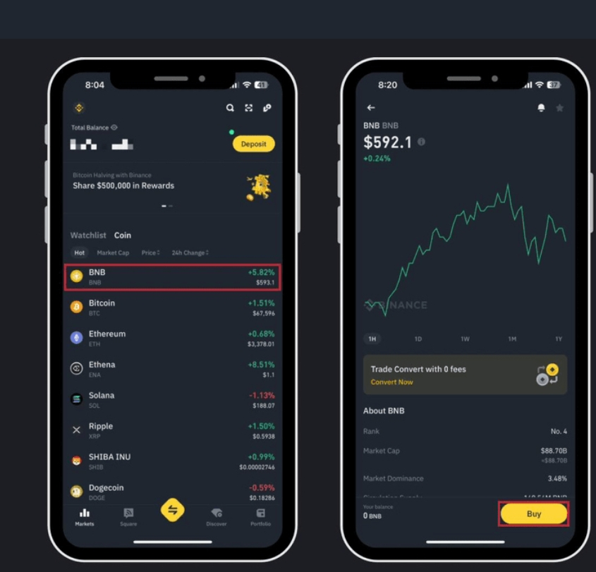 Cliquez sur la cryptomonnaie que vous souhaitez acheter. Disons que vous voulez acheter BNB. Cliquez sur BNB, une page apparaîtra où vous verrez un simple graphique de tendance BNB, le prix actuel et les spécificités de la pièce.