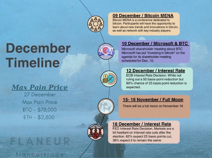 Comme je l'ai mentionné dans mon analyse de novembre, 70k n'était que le début, et les mouvements à la hausse ont créé une excellente atmosphère pour tout le monde. Nous avons laissé derrière nous un mois où le BTC n'a pas pu toucher 100k, l'ETH a continué à montrer des faiblesses, et le XRP a affiché ses hausses classiques et implacables. Maintenant, nous avons un calendrier rempli de décisions sur les taux d'intérêt, de conférences et de discussions sur le Bitcoin à venir. La région européenne et les États-Unis seront occupés avec des décisions sur les taux d'intérêt et des données sur l'inflation dans les deuxième et troisième semaines de décembre. Bien que la baisse de 25 points de base de la BCE soit considérée comme certaine, il y a moins de certitude concernant la FED. De plus, les actionnaires de Microsoft se réuniront pour discuter du BTC, ce qui sera une nouvelle significative pour le Bitcoin.