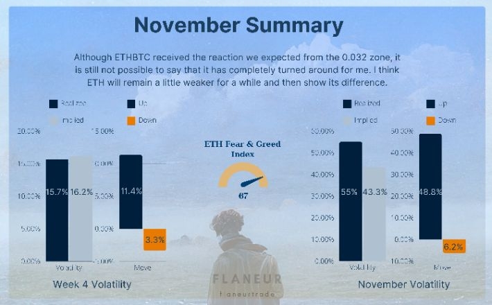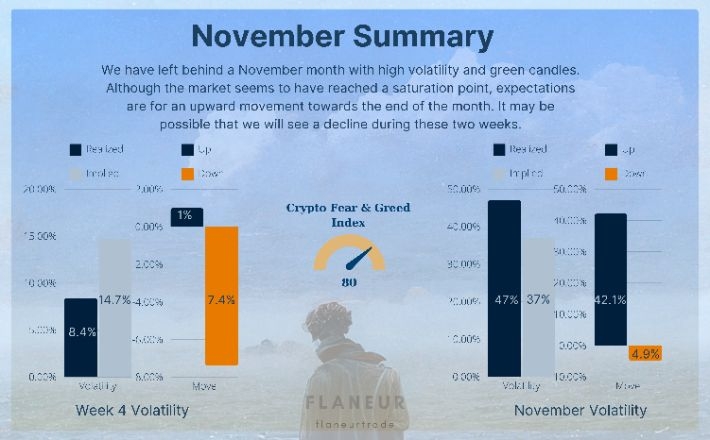 Le BTC, qui n'a pas encore atteint le prix de 100k, a clôturé la dernière semaine avec une baisse. En novembre, nous avons commencé à voir le mouvement prévu alors que la volatilité implicite a augmenté de 10 % par rapport aux attentes. Tout le monde se demande ce que le prix fera ce mois-ci, qui marque à la fois la clôture du T4 et de fin d'année.