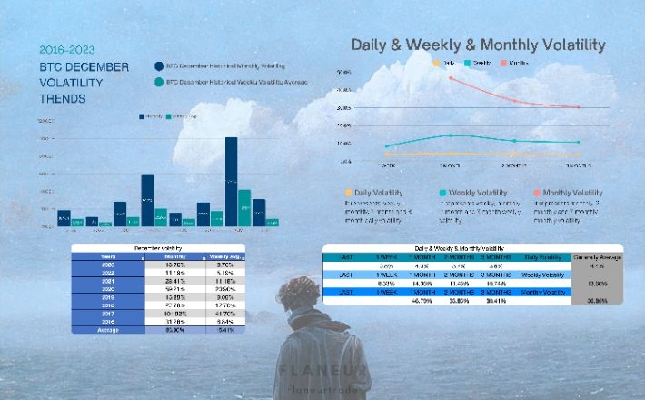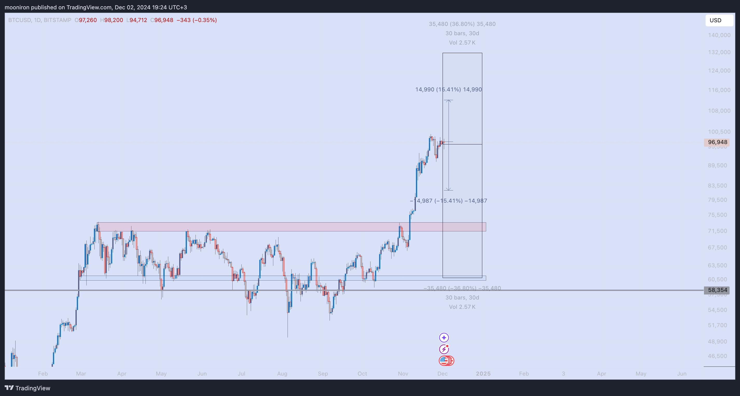 Il a ouvert décembre à 96 500 $, et nous pouvons prévoir une volatilité implicite mensuelle d'environ 37 % et hebdomadaire de 15,4 %. Cela nous montre une plage mensuelle de 61k à 132k, et une plage hebdomadaire de 82,5k à 112k. Je pense que la bande de 87k agira comme une zone de pivot, avec la région de 78k servant de soutien en dessous.