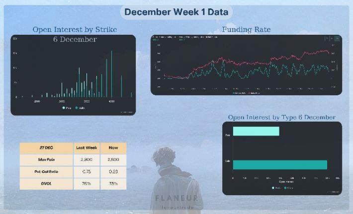 Pour le 6 décembre, les attentes pour l'ETH sont plus positives, et la densité des contrats d'options est très élevée pour la fin du mois. Le ratio Put/Call est de 0,48 pour le 6 décembre et de 0,29 pour la fin du mois, montrant une perspective très haussière. Je pense que nous ne devrions pas manquer les mouvements à la hausse lors des corrections.