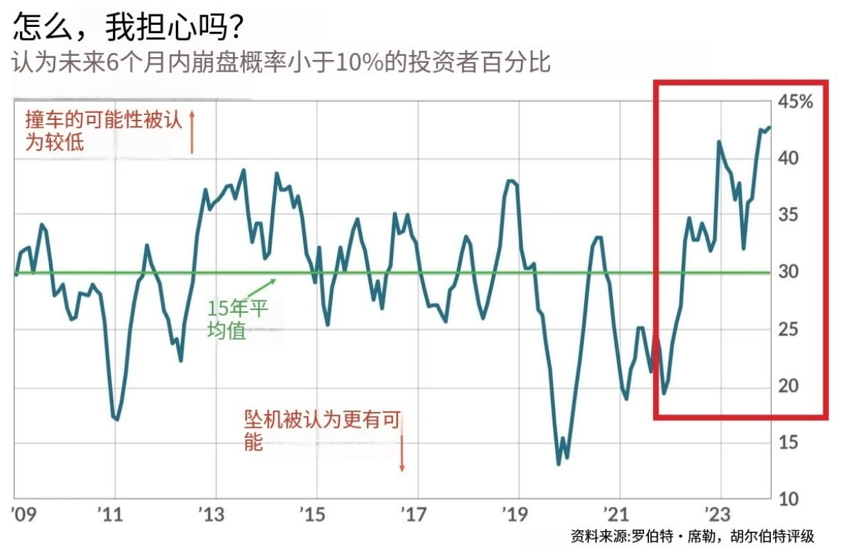 6,43 % des investisseurs individuels estiment qu'il n'y aura pas de krach boursier au cours des six prochains mois, c'est le pourcentage le plus élevé jamais enregistré, ce pourcentage a doublé en seulement deux ans avec le rebond du marché, il semble que la confiance soit omniprésente (voir Fig. 3)