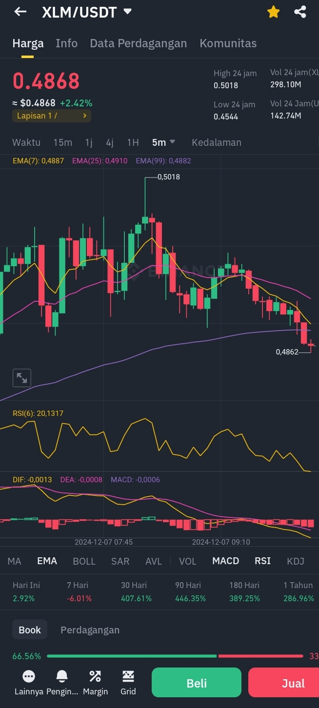 Si le prix franchit le support à 0,4862 $ avec un chandelier baissier fort et un volume élevé, cela pourrait être un signal pour continuer à vendre.