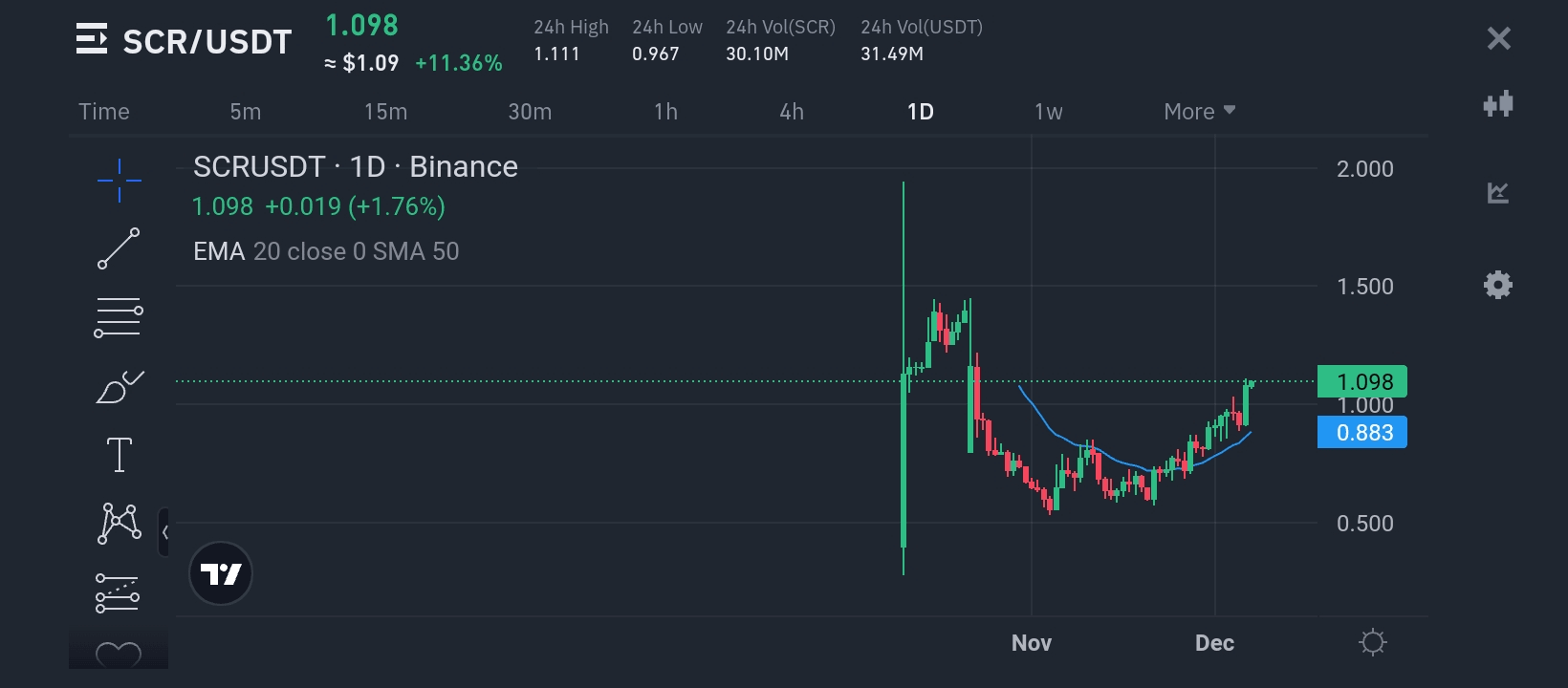 La paire SCR/USDT a gagné en momentum, avec un prix actuel de 1,098 $, reflétant une augmentation de 11,36 % au cours des dernières 24 heures. Voici une analyse approfondie des indicateurs clés et de l'analyse technique :